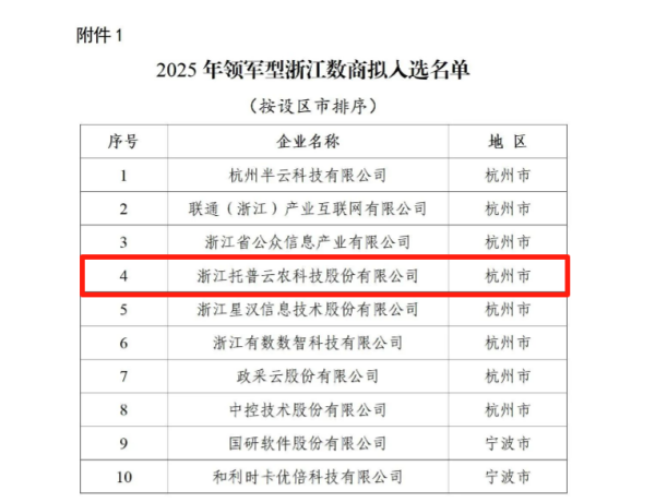 近日,浙江省經(jīng)濟和信息化廳公布《關(guān)于2025年浙江數(shù)商入選名單(領(lǐng)軍型、成長型)》,浙江托普云農(nóng)科技股份有限公司(股票簡稱:托普云農(nóng),股票代碼:301556)憑借在智慧農(nóng)業(yè)大數(shù)據(jù)領(lǐng)域的持續(xù)創(chuàng)新與實踐成果,成功入選!