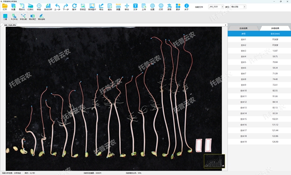 9.種子萌發(fā)和根系分析測定:常用于種子活力、種子發(fā)芽率、種子品質(zhì)性狀研究、基因育種、基因定位等研究領(lǐng)域,可用于單次自動識別≥30粒黃豆、綠豆等種子發(fā)芽后的胚軸長(芽長)、根長、種子發(fā)芽率等參數(shù)。